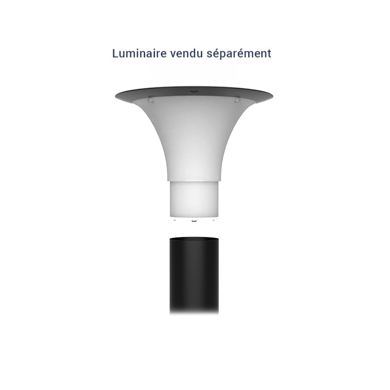 Le potelet est conçu pour être fixé au sol (par vissage sur une base solide ou un socle d'ancrage). Il est creux pour garantir une structure légère tout en assurant une bonne résistance aux intempéries (il doit maintenir l'indice de protection IP65 de la tête lumineuse).